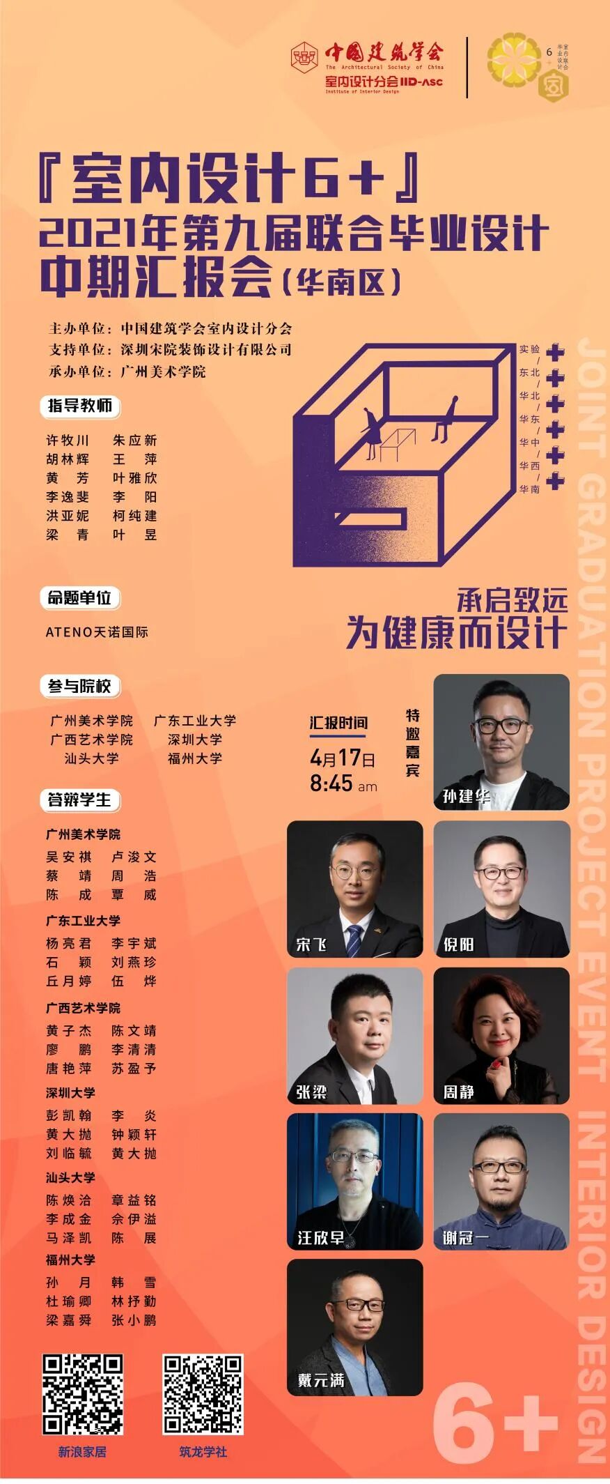 受邀参加会议的有中国建筑学会室内设计分会领导、嘉宾,以及来自广州美术学院、广东工业大学、广西艺术学院、深圳大学、汕头大学、福州大学六所高校的12名指导教师和36名学生代表,此外新浪家居和筑龙学社全程线上直播吸引了约15.5万师生观看。