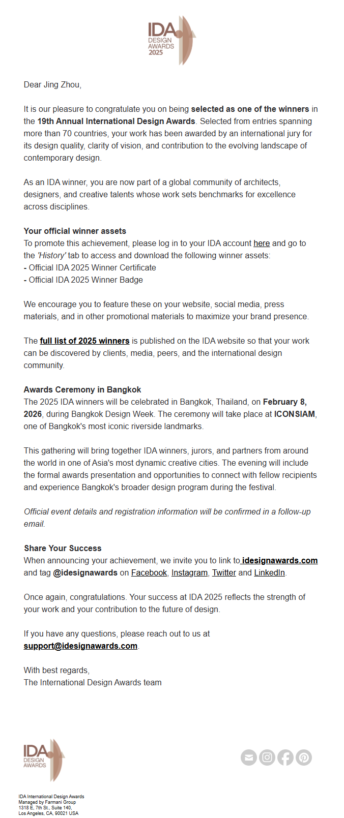 美国国际设计大奖(IDA)创立于2007年,总部位于美国洛杉矶。作为全球最具权威的国际设计奖项之一,IDA 倡导设计的可持续性、科学性与智能性,旨在发掘和表彰建筑、室内、产品、平面及时尚设计领域的新兴人才与杰出远见者。
